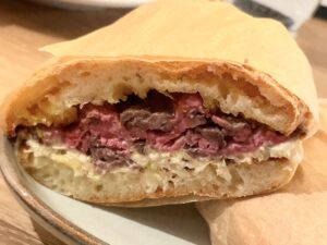 ローストビーフは道産牛のランプ肉を使い、柔らかな口当たりはチャバタとのマッチングも見事。かなりのボリューミーで食べ応えも十分です。