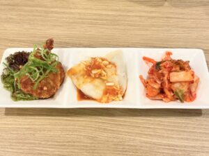 おつまみは「キムチ」に「水餃子」、そして名物のひとつ「ザンタレ」の惣菜三種。