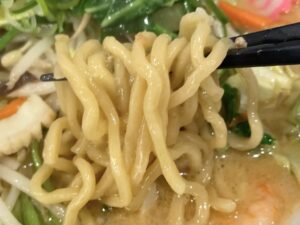 野菜をかき分けようやく見えた麺は中太縮れのモッチリ系。スープがよく絡み、野菜とも相性良くその食感を楽しめます。